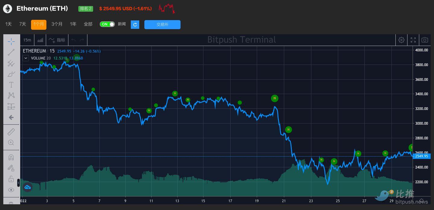 自 2021 年 12 月达到 4100 美元的高位以来,以太坊的估值一直在 3,000 美元至 4,000 美元之间徘徊。然而,以太坊价格最近几天大幅下跌,达到三个月内的最低点。据比推终端数据显示,目前以太坊的交易价格为 2549 美元。